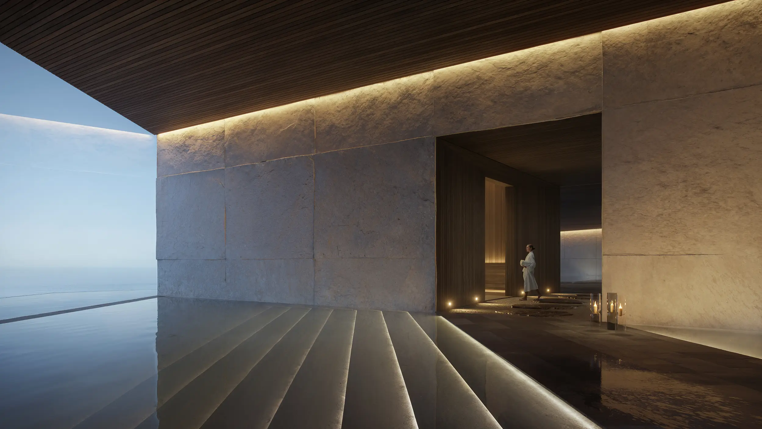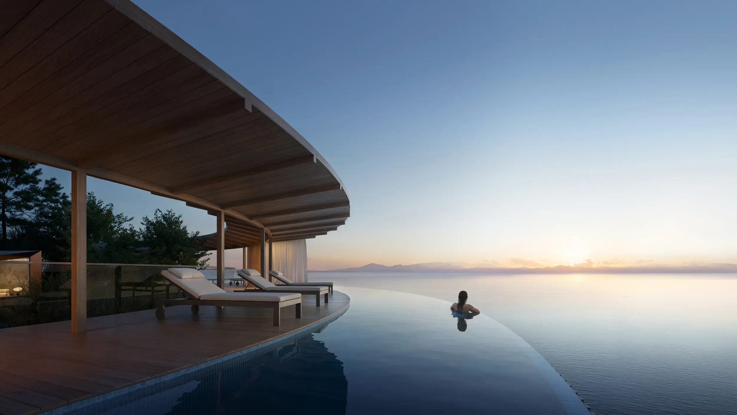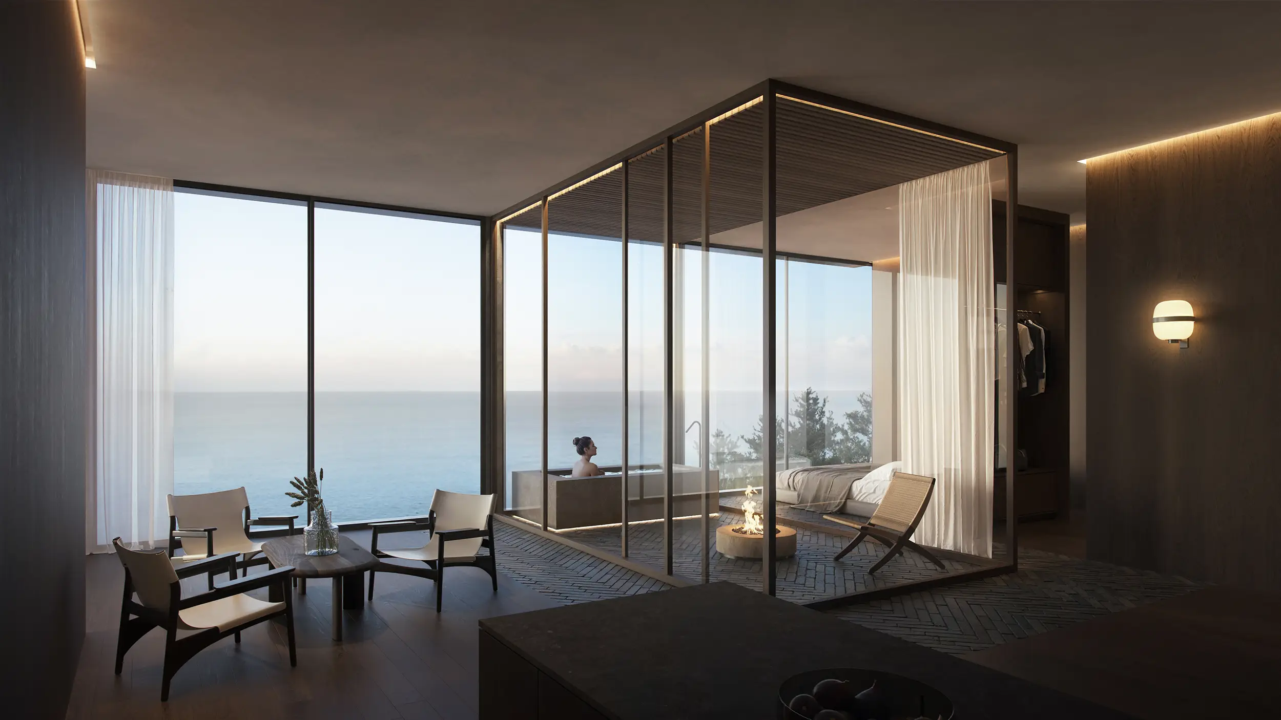 The exterior and interior visualizations were conceived as a unified narrative. Interior spaces are shaped by natural materials, controlled daylight, and framed views toward the landscape, supporting an atmosphere of privacy, stillness, and immersion characteristic of a resort setting.