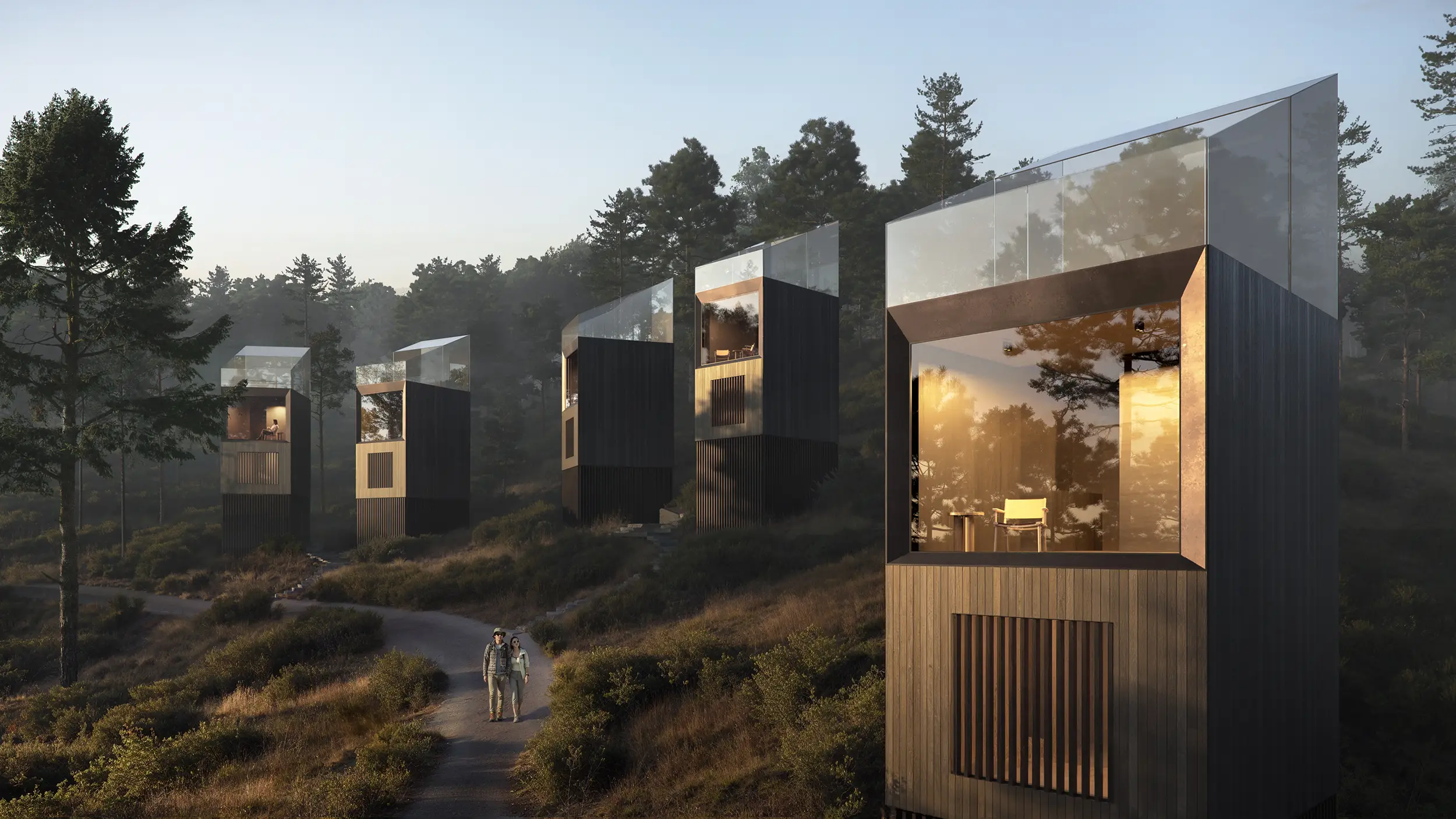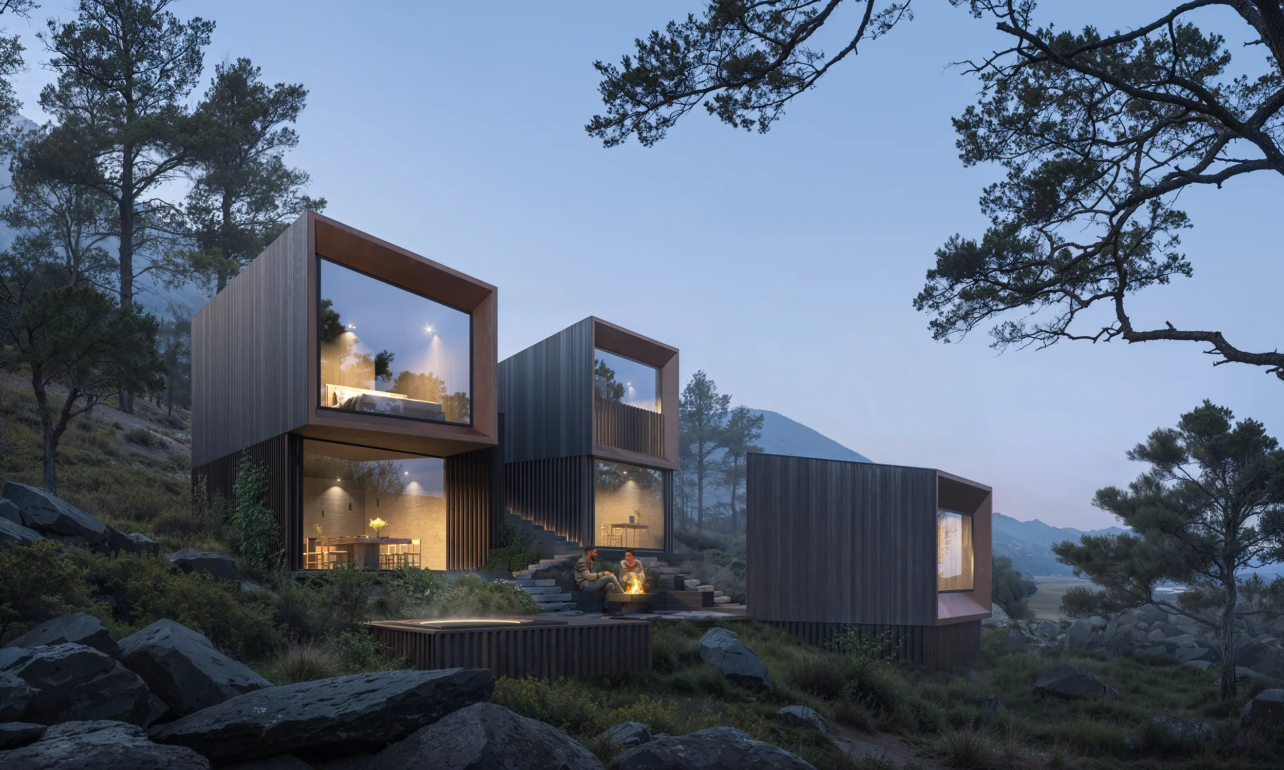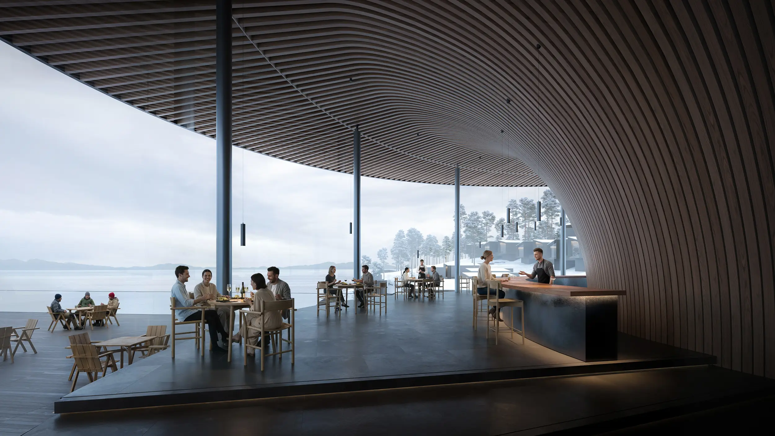 The exterior and interior visualizations were conceived as a unified narrative. Interior spaces are shaped by natural materials, controlled daylight, and framed views toward the landscape, supporting an atmosphere of privacy, stillness, and immersion characteristic of a resort setting.